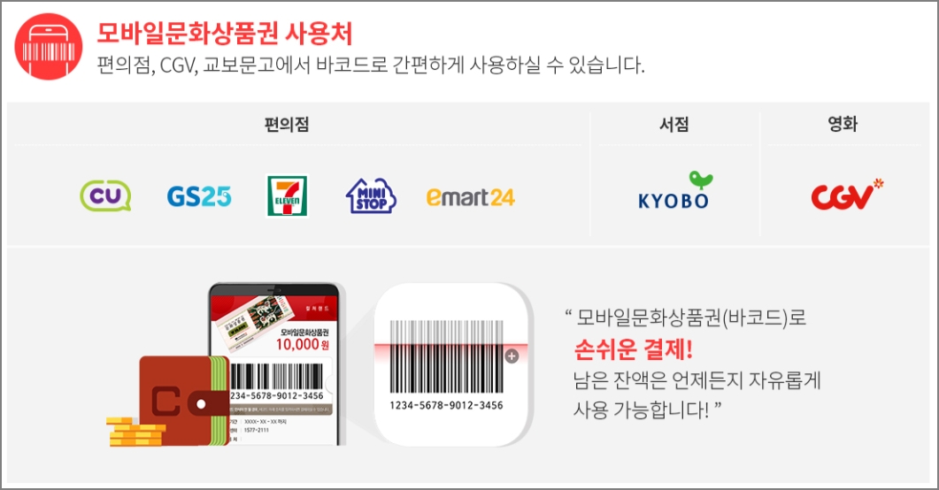 오프라인에서는 모바일 문화상품권의 바코드 결제 기능을 이용하거나, 실물 상품권을 제시해 사용하는 방식입니다.